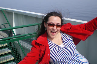 From there, we parked the car, and caught the Ferry over to Seattle. It was a really large ferry, and lots of people took their cars on, but we just 'walked on'. The weather was really 'brisk and fresh' as I like to say, but we were worried about being a little chilly later in the day, so Emily had lent me a really cute red jacket she has. The ferry ride took about 35 minutes, and was really fun. First, it was quaint and pretty with great views, then it was really windy, and then it was FREEZING! I had on a big jacket and a scarf and I was FREEZING! :) We lasted about 25 minutes, but we had to go and take shelter for the last 10 minutes or so :)